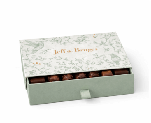 Bonbons de chocolats assortis. Ingrédients : chocolat noir (masse de cacao (fèves de cacao origine Équateur), sucre, beurre concentré (LAIT), beurre de cacao, émulsifiant : lécithines (SOJA), arôme naturel de vanille), sucre, chocolat au lait (sucre, LAIT entier en poudre, masse de cacao (fèves de cacao origine Équateur), beurre de cacao, émulsifiant : lécithines (SOJA), arôme naturel de vanille), chocolat blanc (sucre, beurre de cacao, LAIT entier en poudre, émulsifiant : lécithines (SOJA), arôme naturel de vanille), NOISETTES, pâte de cacao, beurre de cacao, LAIT entier en poudre, beurre de karité, massepain (sucre, AMANDES, sirop de glucose, stabilisant : glycérol de colza, PISTACHES, stabilisant : sorbitols, arôme naturel de pistache), huile de noix de coco, AMANDES, beurre (LAIT), crème (LAIT), huile de tournesol, éclats de crêpes dentelle (farine de BLÉ, sucre, beurre concentré (LAIT), LACTOSE (LAIT), protéines de LAIT, sel, farine d’ORGE malté, poudre à lever : carbonates de sodium), caramel (sirop de glucose, LAIT concentré sucré (LAIT écrémé, sucre), huile de noix de coco, eau, stabilisant : glycérol de colza, émulsifiants : mono- et diglycérides d’acides gras et lécithines (SOJA), sel, arôme naturel), sirop de glucose, stabilisant : glycérol de colza, meringue (sucre, beurre de cacao, amidon de BLÉ, huile de noix de coco, protéines de LAIT, poudres à lever : carbonates de sodium et carbonates d’ammonium, blanc d’OEUF), beurre concentré (LAIT), poudre de cacao dégraissé, stabilisant : sorbitols, confiture de cerises (sirop de glucose et fructose, cerises, sucre, épaississant : pectine, correcteur d’acidité : acide citrique), LAIT écrémé, eau, dextrose, arômes et arômes naturels, poudre de cacao, sirop de sucre inverti, cerises, riz soufflé (farine de riz, sucre, sel, beurre de cacao), émulsifiant : lécithines (SOJA), purée de fruit de la passion (extrait de fruits de la passion, sirop de sucre), purée de pommes, biscuit au beurre (farine de BLÉ, sucre, beurre (LAIT), OEUF, amidon de BLÉ, sel, poudre à lever : carbonates d’ammonium), fèves de cacao, nougat (sucre, sirop de, AMANDES, miel, beurre de cacao, amidon de pomme de terre, blanc d’OEUF, arôme naturel de vanille), noix de coco, sirop de sucre candi, stabilisant : sorbitols, farine de BLÉ, huile de maïs, café, amandes d’abricot, graines de SÉSAMEOEUF, raisins secs, sirop de glucose-fructose, spéculoos (farine de BLÉ, sucre, huile de colza, sirop de sucre candi, beurre concentré (LAIT), poudre à lever : bicarbonates de sodium, sel, cannelle), écorces d’oranges confites (écorces d’oranges, sucre, sirop de glucose-fructose, correcteur d’acidité : acide citrique), NOIX de pécan, thé Earl Grey, blanc d’OEUF, extrait sec de citron, jus de pulpe de cacao concentré, pulpe de cacao, sirop de sucre, amidon de BLÉ, sucre caramélisé, épices (cannelle, clou de girofle), sel de Guérande, mangue, framboises, coriandre, LAIT écrémé en poudre, amidon de riz, sel, correcteurs d’acidité : acide citrique et acide malique, colorant : caramel d’ammonium, extrait de paprika, aliments colorants (concentrés de spiruline, de pomme, de groseille, de radis et caroténoïdes), citron, jus de citron vert concentré, jus de sureau, citron yuzu, gingembre, amidon de tapioca, poudres à lever : carbonates d’ammonium et carbonates de sodium, piment d’Espelette, arômes naturels (cacao, orange, vanille, framboise, yuzu), extrait naturel de vanille Bourbon, matière grasse laitière anhydre (LAIT), huile de citron vert, émulsifiant : lécithine de tournesol, colorant : curcumine, vanille en poudre. Les recettes peuvent contenir des traces d’arachides et d’autres fruits à coque.