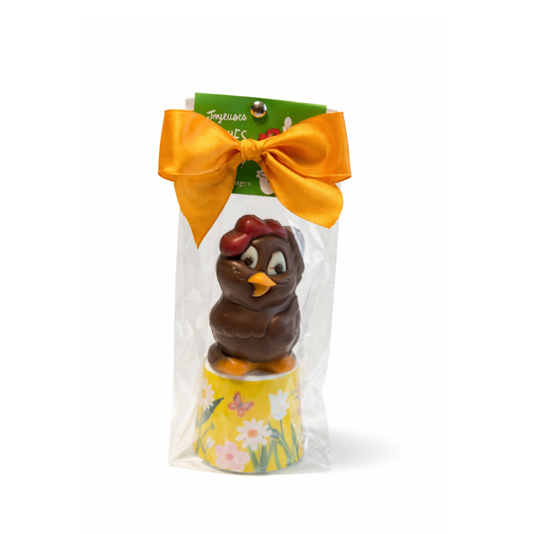 Oeuf creux sous aluminium en chocolat au lait. Ingrédients : sucre,beurre de cacao, lait entieren poudre, pâte de cacao (fèves de cacao origine Afriquede l’Ouest), émulsifiant :lécithine de soja, arôme. Chocolat aulait : 31% cacao min.
