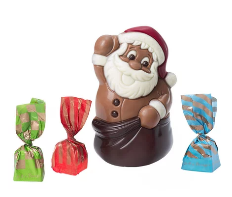 Moulage Père Noël en sac – Chocolat au lait décoré et confiserie colorée. Ingrédients : sucre, beurre de cacao, LAIT entier en poudre, pâte de cacao (fèves de cacao origine Afrique de l’Ouest), LAIT écrémé en poudre, émulsifiant : lécithines, arôme naturel de vanille, colorants : carmin, curcuma.